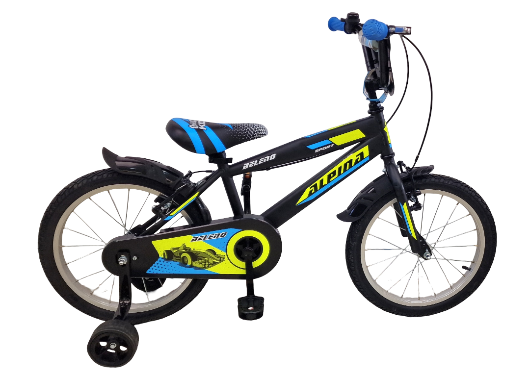 Frame: Steel Brakes: Alloy V-brake Wheels: Alloy Includes: Training wheels, bell, chain cover, and mudguards Age: 5 to 8 years old.
